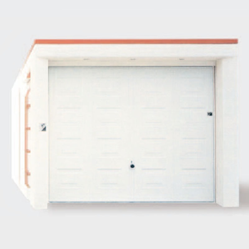Equipement standard pour les garages DUO et GRANDO. Les portes EPU à double paroi avec rainures M, homologuées TÜV selon la norme européenne EN 13241-1. L'injection de mousse est 100% sans C.F.C. La surface des portes sectionnelles est de type woodgrain, mais d'autres surfaces comme silkgrain ou decograin sont disponibles sur demande. La surface est protégée efficacement contre la corrosion. Les portes en acier à double paroi sont livrées de série en blanc signalisation (Blanc tarif RAL 9016). D'autres couleurs sont possibles. Les portes blanches et colorées sont généralement livrées avec une face intérieure en teinte blanc gris (RAL 9002).